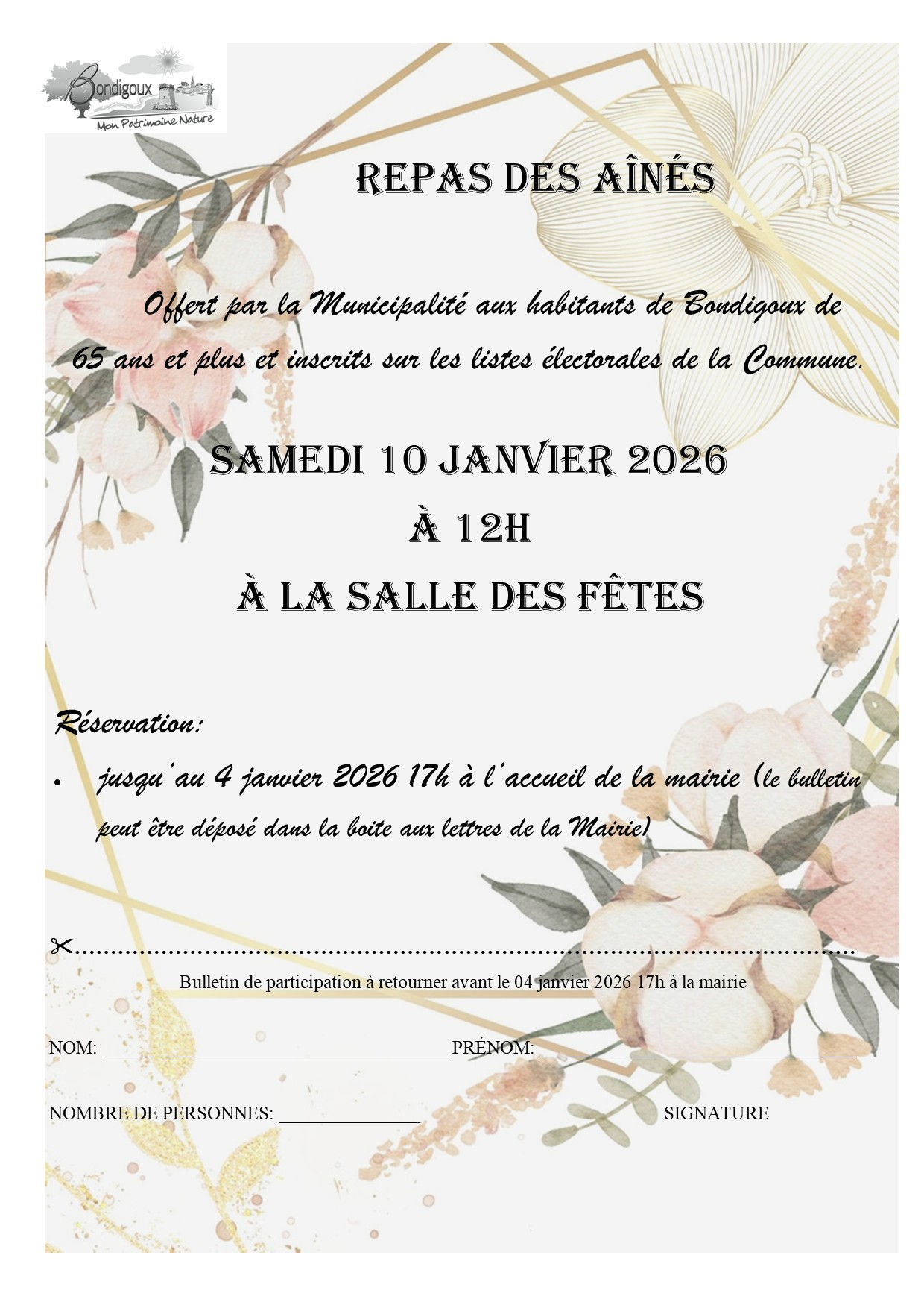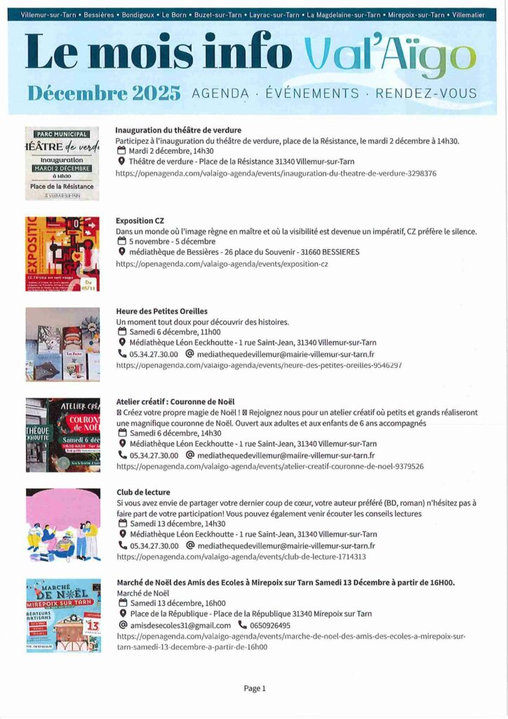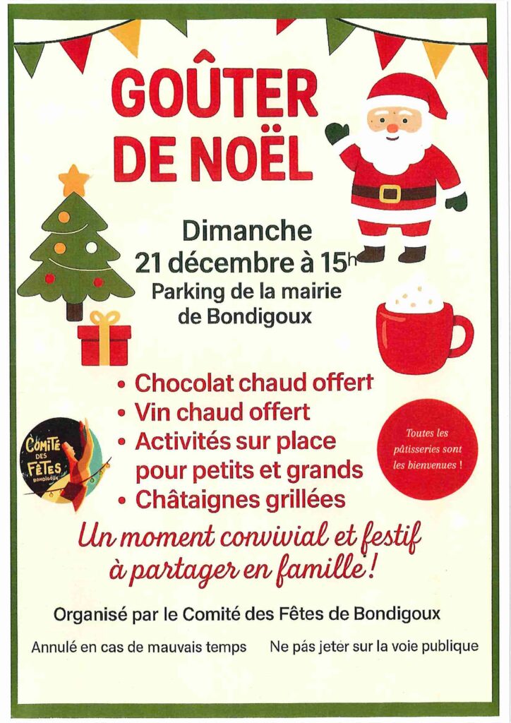 Recensement de la population du 15 janvier au 14 février 2026 GOUTER DE NOEL DIMANCHE 21/12 à 15H PLACE DE LA MAIRIE Mairie fermée du 31 décembre 2025 au 2 janvier 2026 Repas des Aînés le 11 janvier 2026 à 12h à la salle des fêtes Bonnes et heureuses fêtes de fin d'année Mairie fermée du 24 au 26 décembre 2025